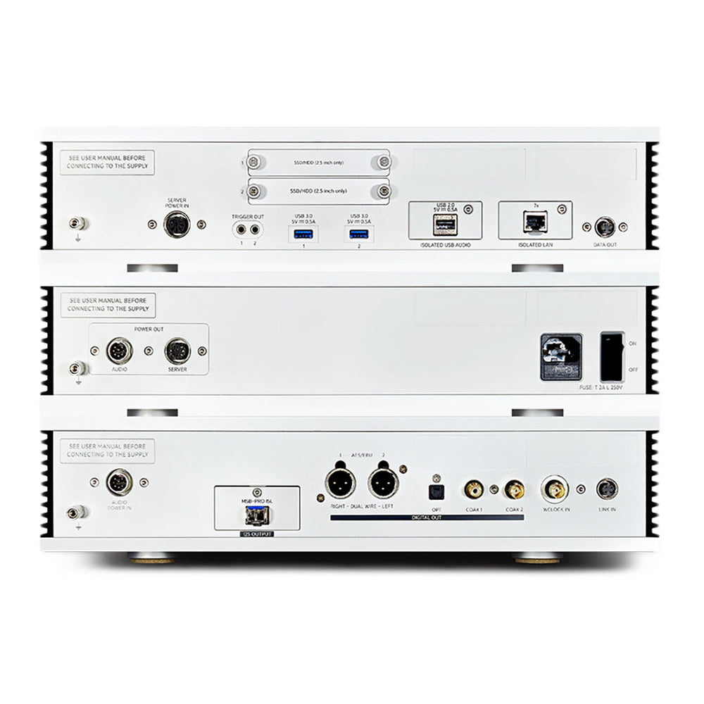 | Digital Outputs | Dedicated USB Audio, Dual AES/EBU (OCXO Controlled), BNC Coax SPDIF (OCXO Controlled), RCA Coax SPDIF (OCXO Controlled), Optical/TosLink SPDIF (OCXO Controlled), I2S module slot (MSB Pro ISL or HDMI I2S) |