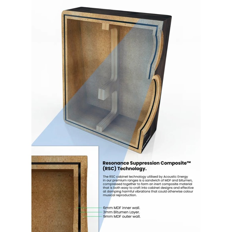 - RSC Cabinet Construction: Employing Resonance Suppression Composite (RSC) technology, the cabinet features constrained layer damping to greatly reduce acoustic radiation and coloration.